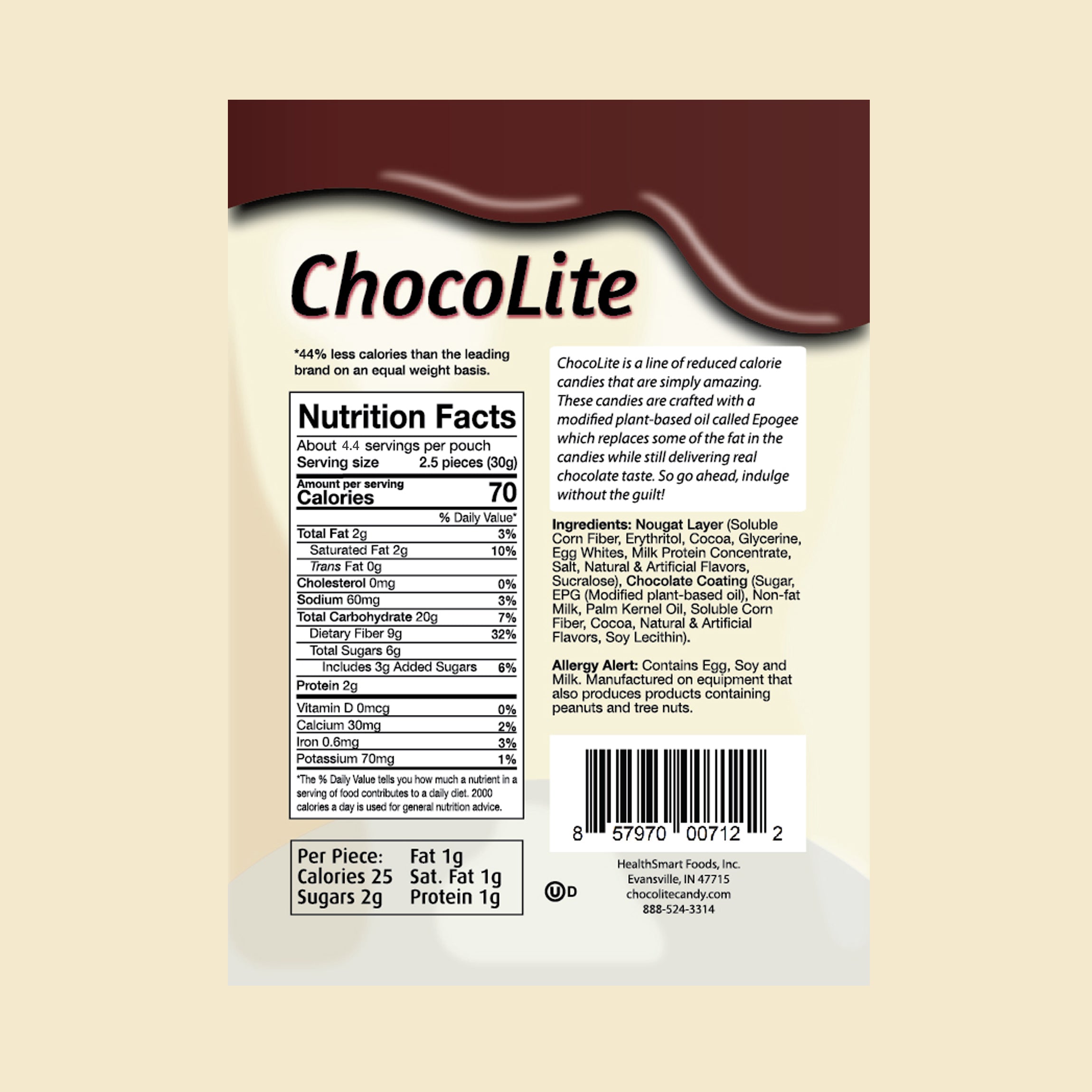 Ingredients: Nougat Layer (Corn Fiber, Erythritol, Cocoa, Glycerine, Egg Whites, Milk Protein Concentrate, Salt, Natural & Artificial Flavors, Sucralose), Chocolate Coating (Sugar, EPG (Modified plant-based oil), Palm Kernel Oil, Corn Fiber, Cocoa, Natural & Artificial Flavors, Soy Lecithin.)